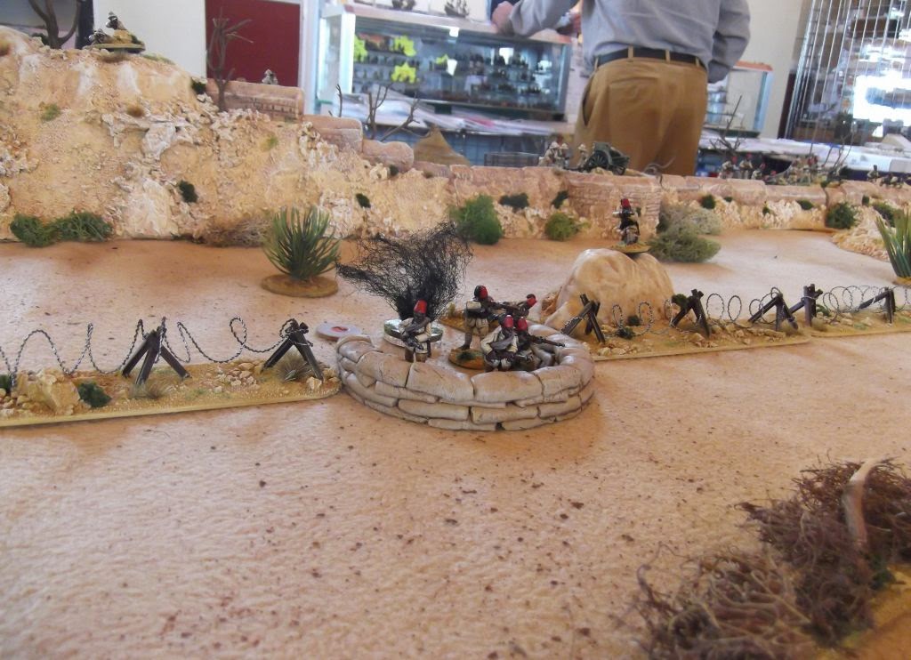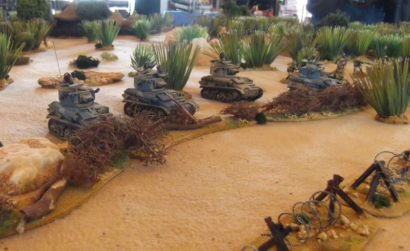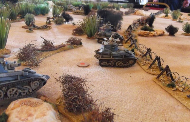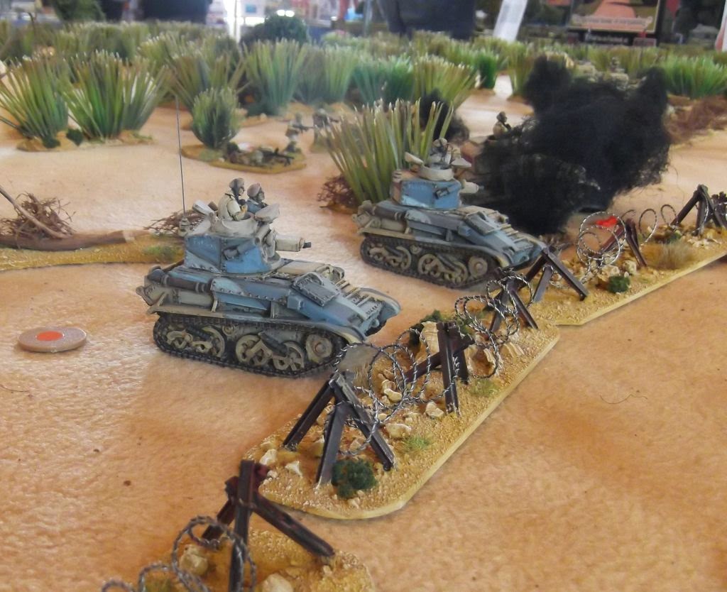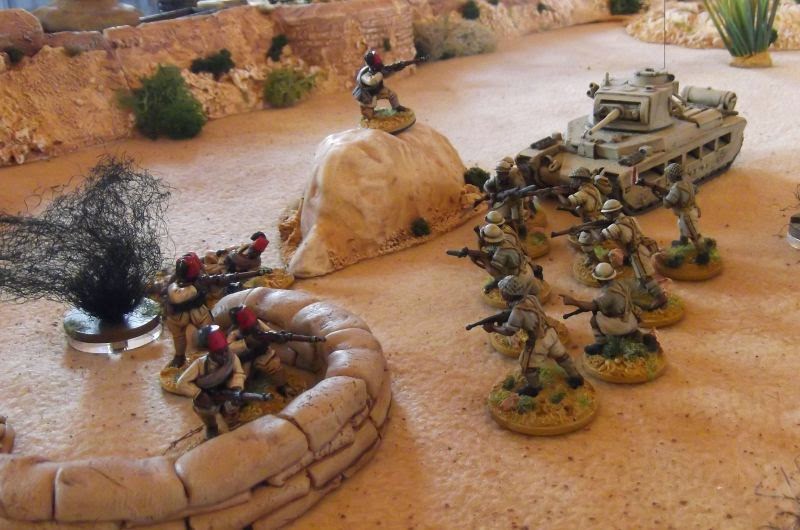 Soon the Indian infantry were lining the zariba although in his haste to rush troops to the front  Lt-Col Tayler became the first British casualty of the game. He was felled by an Italian bullets and a stretcher party rushed him back to the aid station. The British attack now seemed to lose a bit of inertia and the Italians were pinning down the British, two of the MKVI lights also threw tracks, but their concentrated fire first drove away the machine-guns and Solothurns from the fort before them. Having cleared the zariba, the tanks pressed on and cleared the wire but without the Colonel to drive them on the Garhwalis on the right flank were difficult to motivate.
