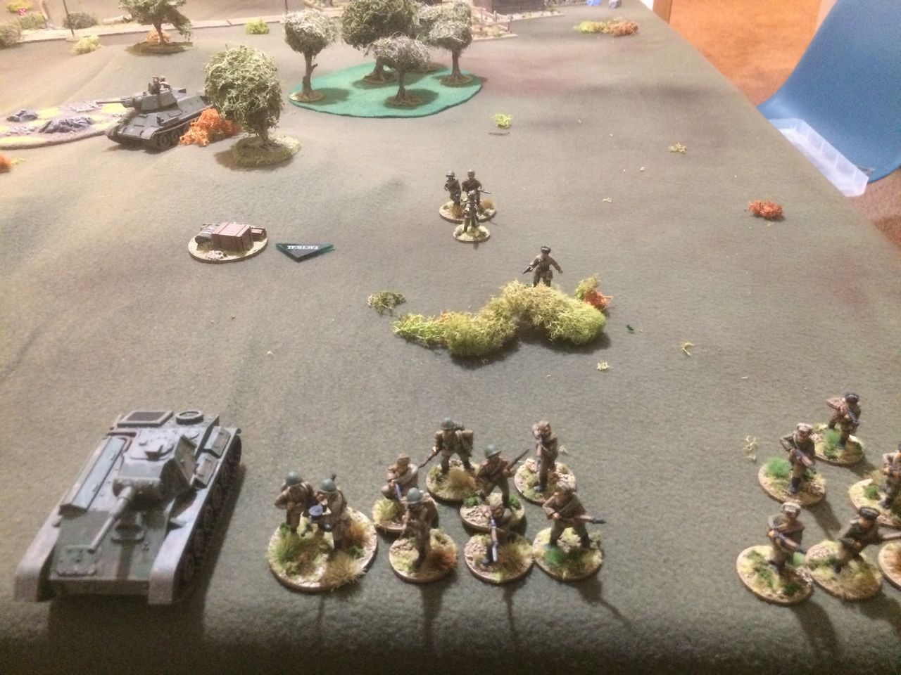 Hoping to take some pressure off I deployed another section in the woods on my left and they were having a ripping rime firing down the road at the Soviets in the village before the T-34 blocked their line of fire.
